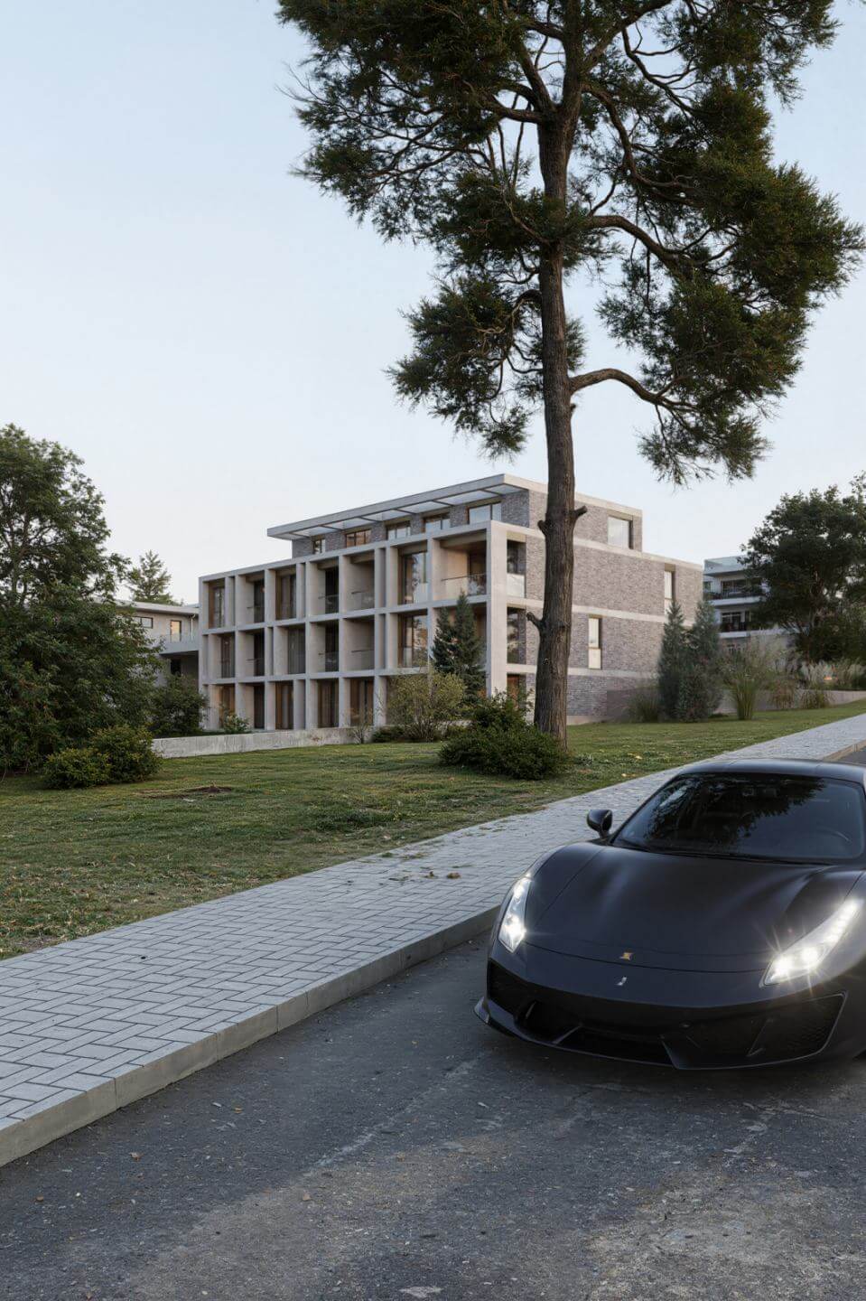 Имотът, в който се проектира сградата, е с площ 1761 кв.м., с неправилна форма и се обслужва от вътрешноквартална улица, разположена по северната граница на имота. Теренът е със силен наклон север-юг, като приблизителната денивелация е 4 м. Предвид ограничителните линии на застрояване и характерния наклон на терена, в имота е предвидена сграда с основна ориентация на югоизток, която е с 1 вход към апартаментите. Входът на сградата е от северозапад откъм обслужващата улица като до него е осигурен достъп по алеи, отговарящи на изискванията за универсален дизайн. Непосредствено към северната улична регулационна линия са предвидени 16 бр. открити паркоместа, което отговаря на изискванията на Наредба РД-02-20-2 , т.1(а) от Прил. №5. В сутерена на сградата са осигурени 7 велосипедни места Клас 1, както и индивидуални складове извън рамките на апартаментите.