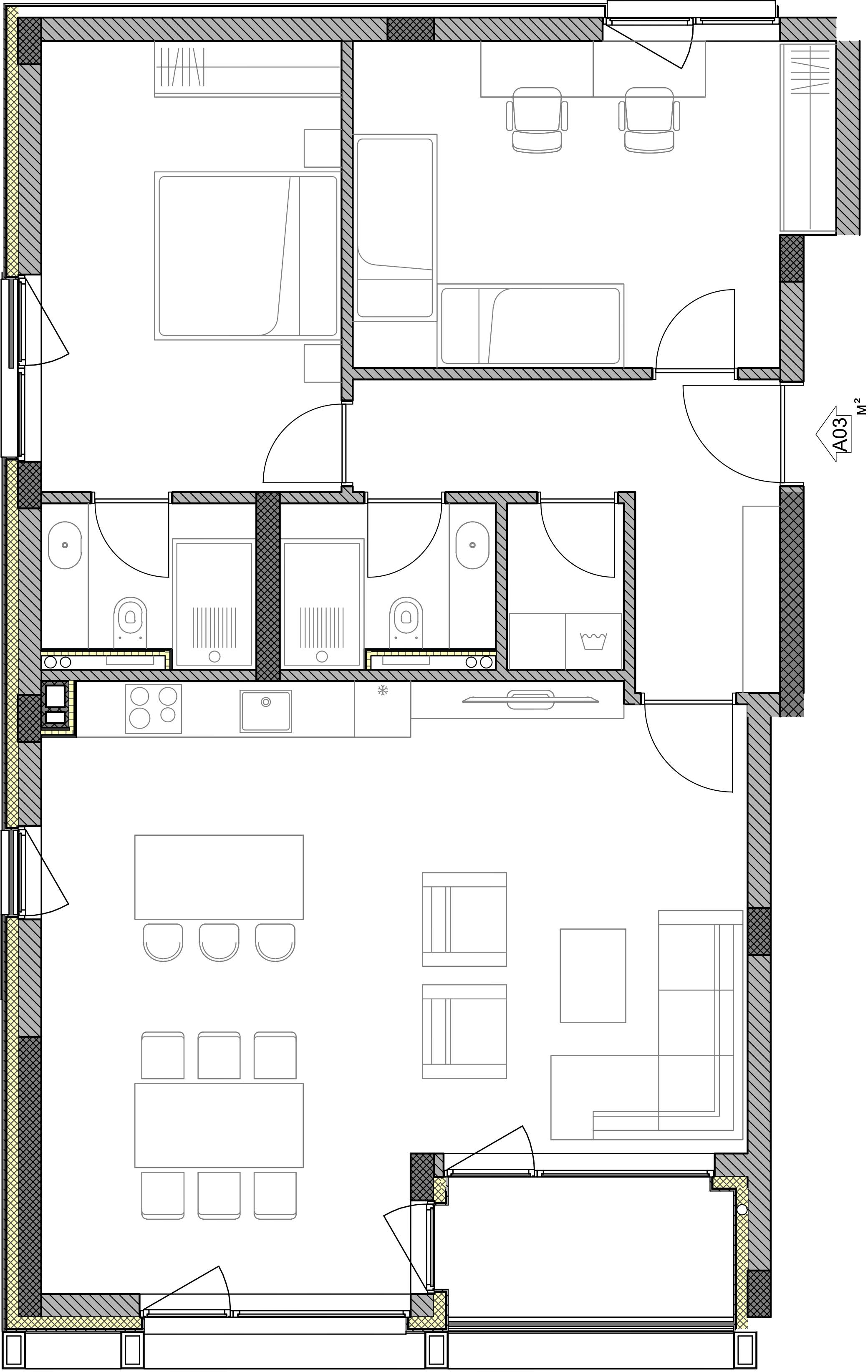 Апартамент – Дневна с кухненски бокс, 2 спални, 2 бани с тоалетна, входно предверие, килер, тераса. Към апартамента има включена маза № МА-03 с обща площ 6,18 кв.м.